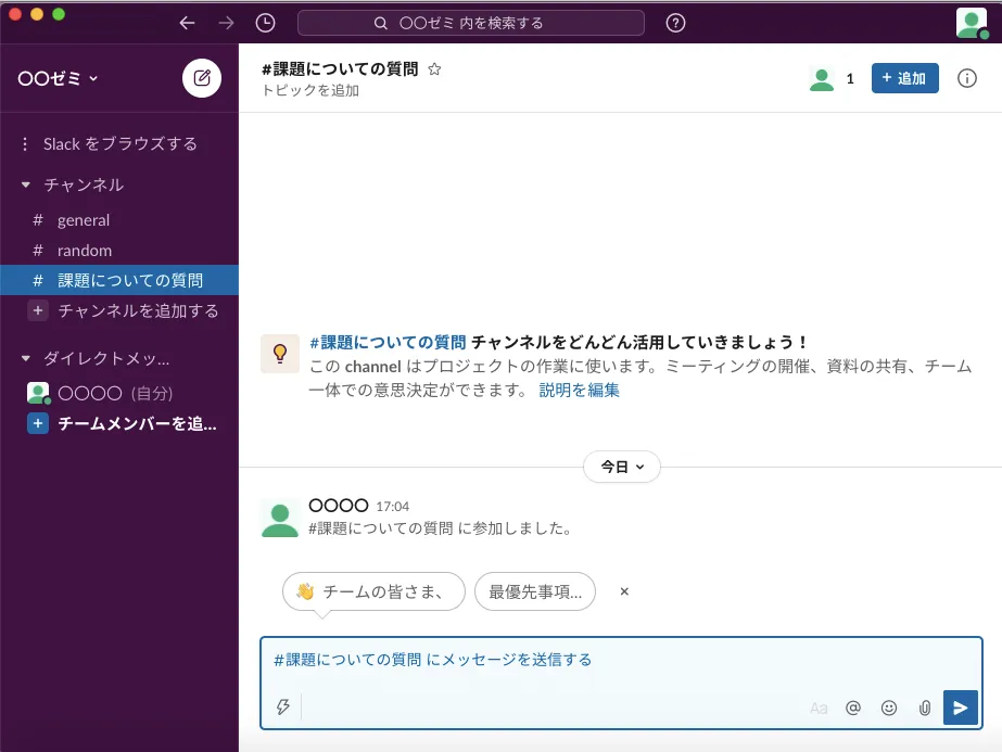 - #generalのチャンネル名を「#全体連絡」に変更しましょう.