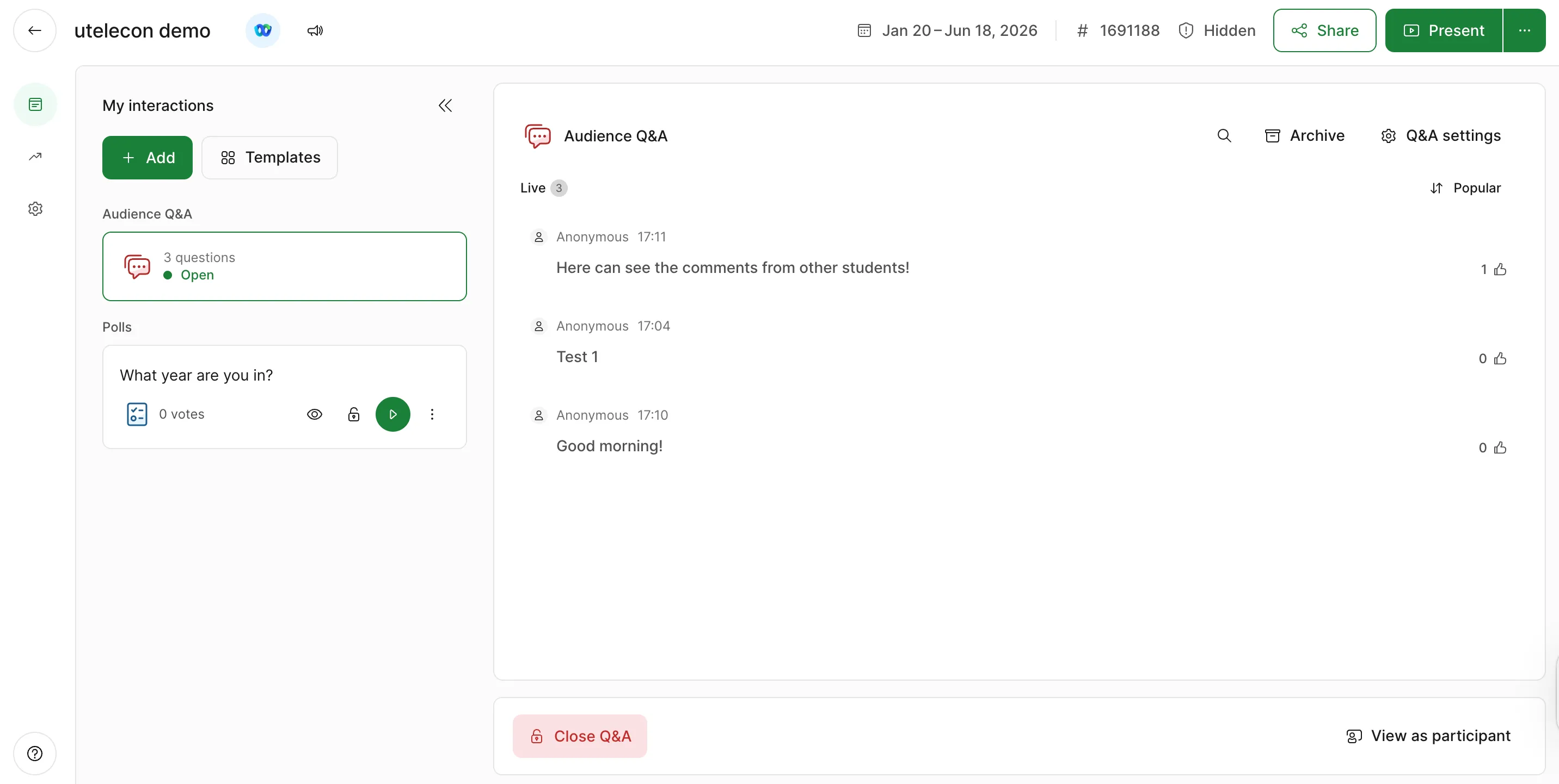 In Slido, the Q&A feature allows students to freely send questions and comments.