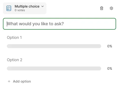 - Survey - Create a survey combining multiple questions (unlike the above 6 types, participants answer multiple questions collectively as one set).
