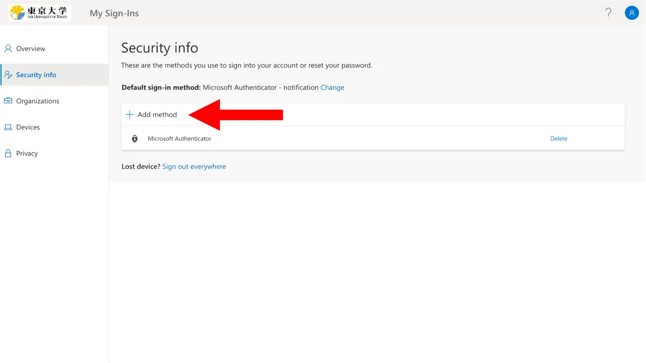- Click “Add method” in the Security info page.