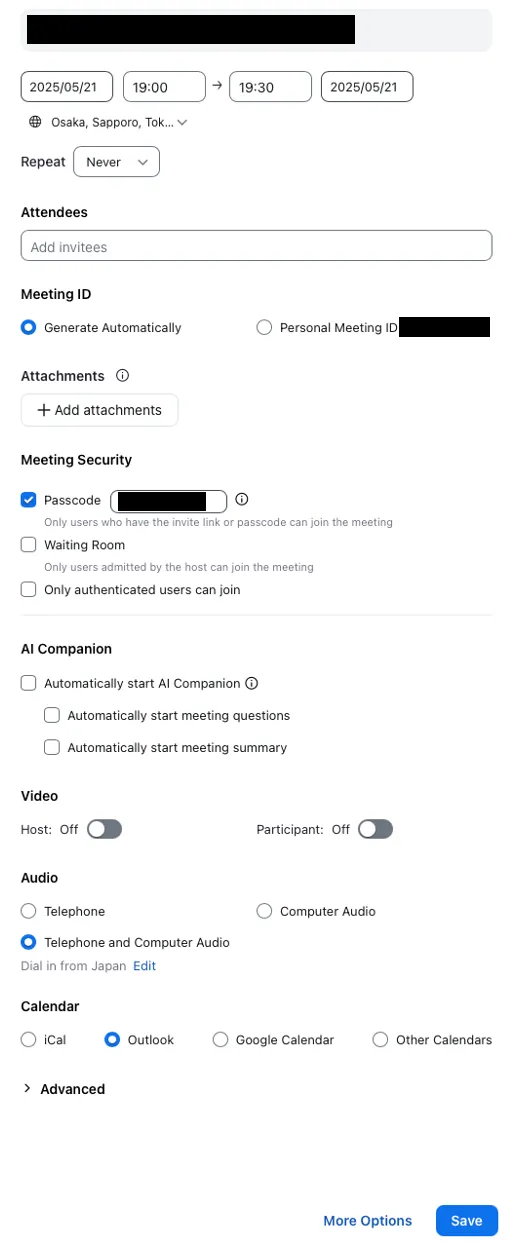 - Press “Save” in the lower right corner. In the previous screen, if you selected “Other calendars” for “Calendar”, a screen such as that shown below will appear. Select the meeting URL, meeting ID, passcode, e.g., listed under “Join Zoom Meeting” and notify the participants by e-mail.