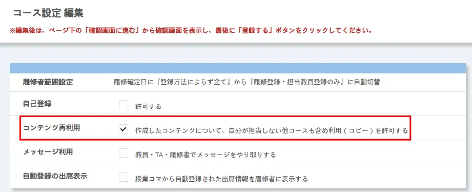 - 「作成したコンテンツについて、自分が担当しない他コースも含め利用(コピー)を許可する」にチェックを入れてください.