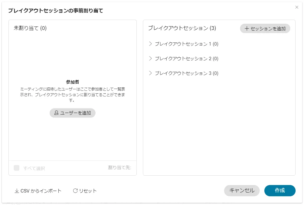 ミーティングの作成時に「ブレイクアウトセッションの事前割当て」をクリックすると,招待した参加者を各ブレイクアウトセッションに割り当てることができます.CSVで割り当てを読み込むこともできます.