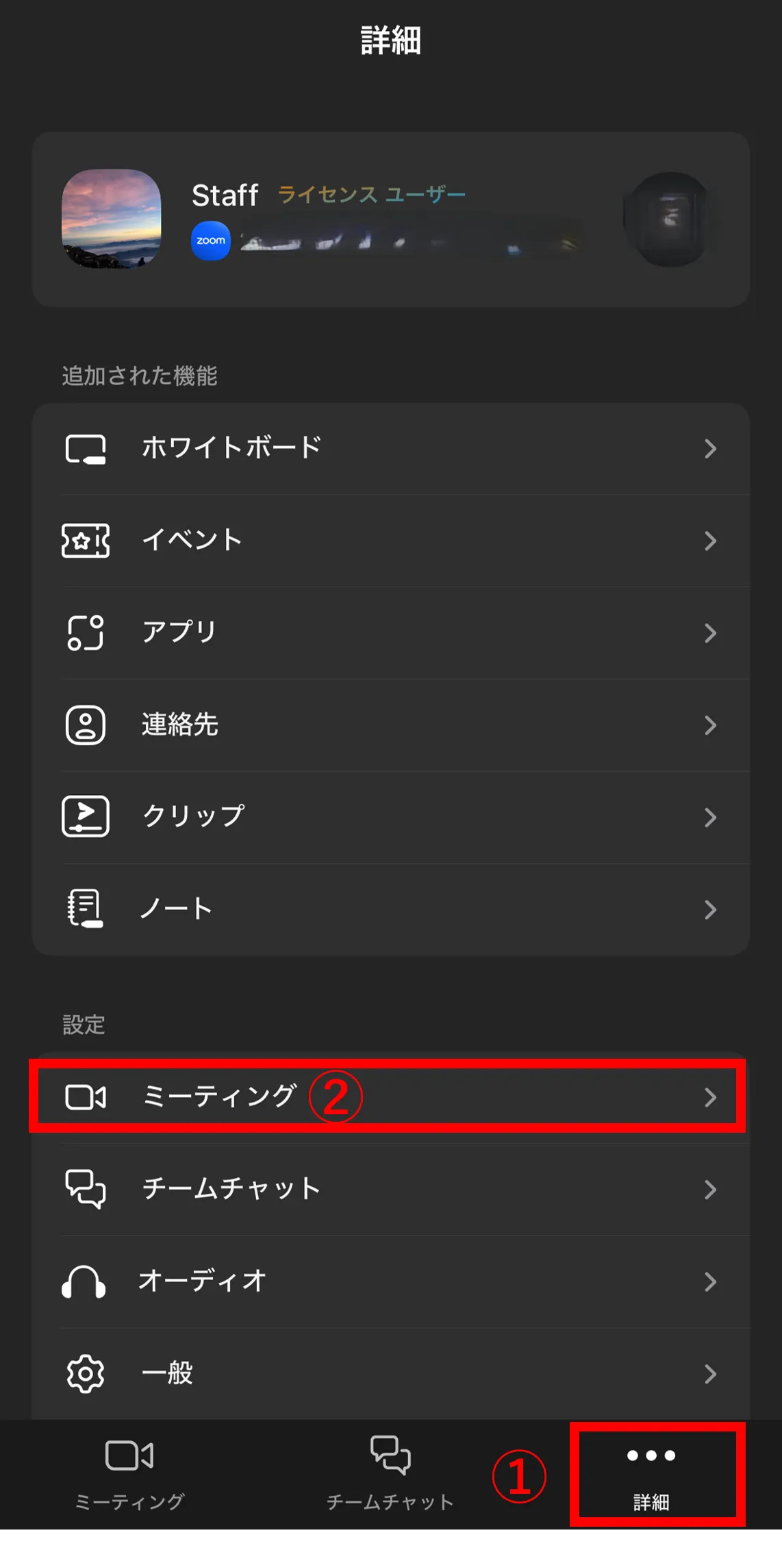 詳細タブの中の,「ミーティング」を押すと,ミーティング中のオーディオやビデオの設定を行うことができます.