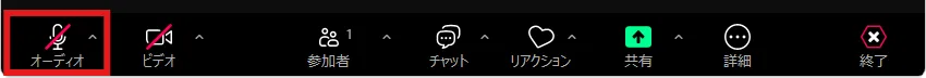 ウィンドウの左下にある「オーディオ」と書かれたマイクのアイコンを押すことによって,マイクをミュート(消音)にしたり,ミュートを解除したりすることができます.ミュートのときはマイクのアイコンに赤線のスラッシュが引かれます.